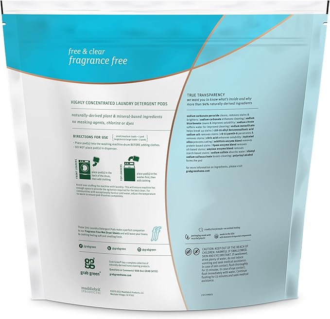 - Contains: 1- 132 Pod Bag of Grab Green Natural Fragrance Free 3in1 Laundry Detergent Pods. Our velcro closure bags are convenient and easy to use, no hassling with frustrating zip closures