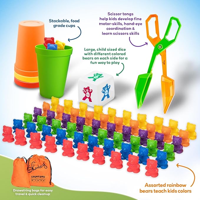 - Fun from A to Z: Our versatile Counting Bears offer countless kindergarten learning activities including sorting, counting, stacking, and matching. Complete with matching sorting cups, bear counters, and a color die, kids can explore various math concepts while enhancing fine motor skills and hand-eye coordination.