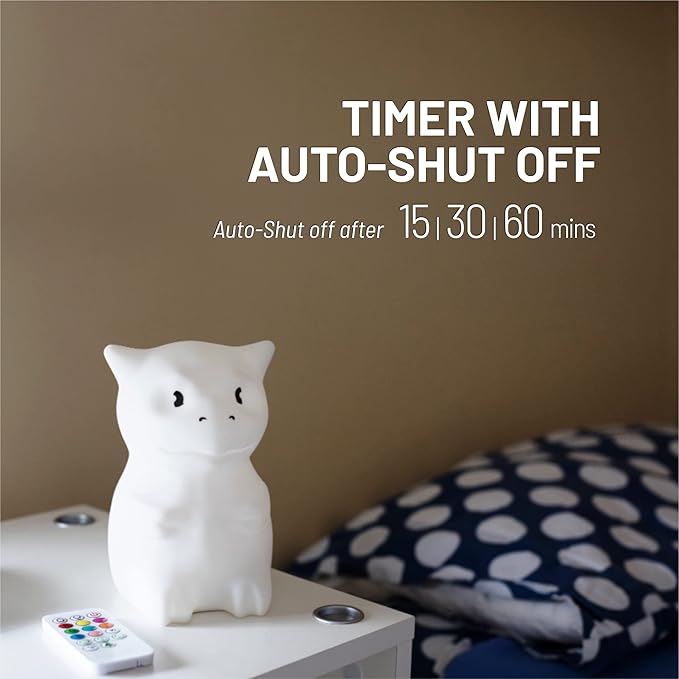 - Remote Control Operated Night Light For Kids - The included remote control lets your child choose colors remotely, or press firmly on the squishy light to cycle through them. The timer has three options for auto-shutoff: 15,30, or 60 minutes.