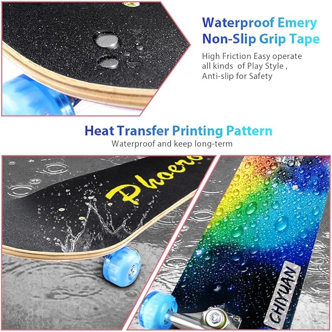 - 【STICK MATERIAL】 7-Ply 31" L x 8" W x 4" H Maple Wood make the wood deck very durable and can bear 220lbs weight , Super soft PU Wheels cut off damping when you riding , Alloy Truck provide more steady structure for skateboard, ABEC-11 Bearings make the wheels turn around more smoothly , Pattern: Heat Transfer(which was printed onto the board,not a sticker.) make the pattern durable a long time.