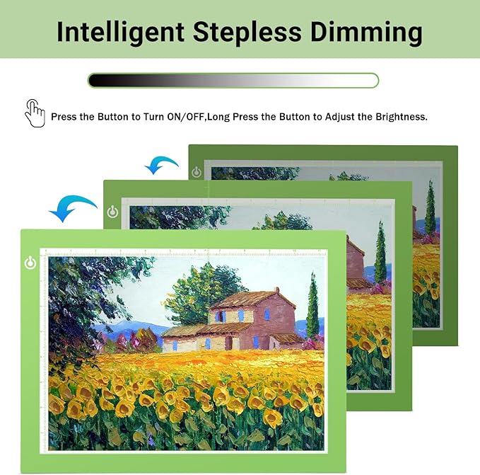 - 【ADJUSTABLE BRIGHTNESS】 The brightness of the tracing light box is adjustable for you to get the desired brightness by gently pressing the touch switch for several seconds.