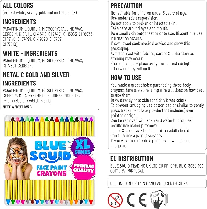- π π¨π‘ππ’ππ π¬π’π¨π₯ πππ'π¦ ππ₯πππ§ππ©ππ§π¬ - Blue Squid face paint crayons offers versatile tools for your child's artistic expression, suitable for a wide range of activities including school events and theatrical performances. As a Blue Squid customer, you'll get instant access to an exciting free bonus - an online kids facepainting ideas guide with step-by-step videos that show you how to whip up fantastic face paint designs!