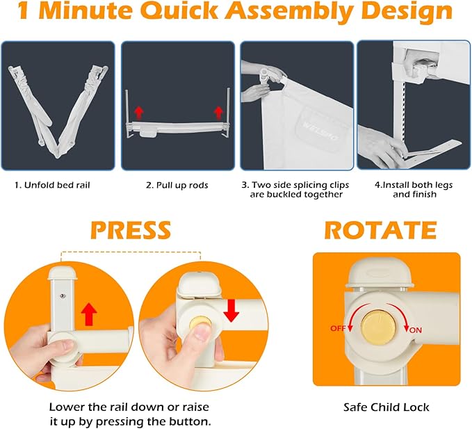 - π Easy to Install - By detailed instructions, no tools, easy to install, no problems. Easy to operate, pull the toddler bed rail up and you can easily attach the bed rail for kids to the anchor. Press the button to hide the bed rail for toddlers between the mattresses. (The bed rail needs to be screwed to the frame, that way could protect the child's safety. It is not recommended to be used on a platform or similar style bed.