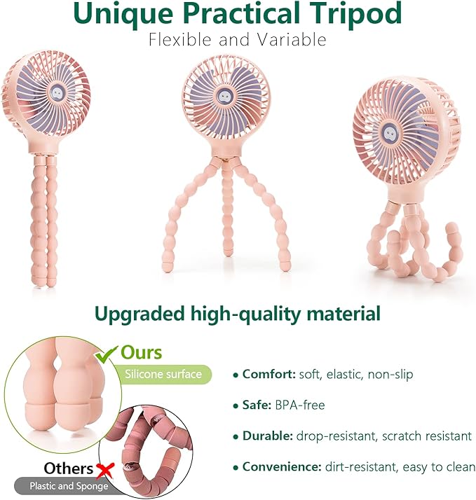 - 【Upgraded Flexible Unbreakable Tripod】snawowo baby stroller fan has an upgraded tripod which is made of high quality bendable metal and food grade silicone surface instead of the old plastic and sponge surface. so you don't have to worry about the baby eating it by mistake. The tripod is waterproof, not easy to get dirty and broken, easy to clean, and more anti-wear.
