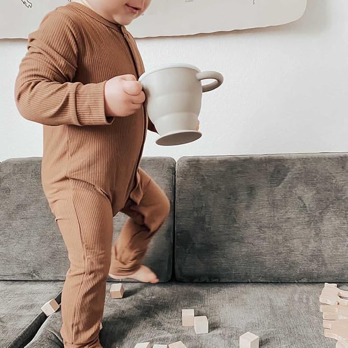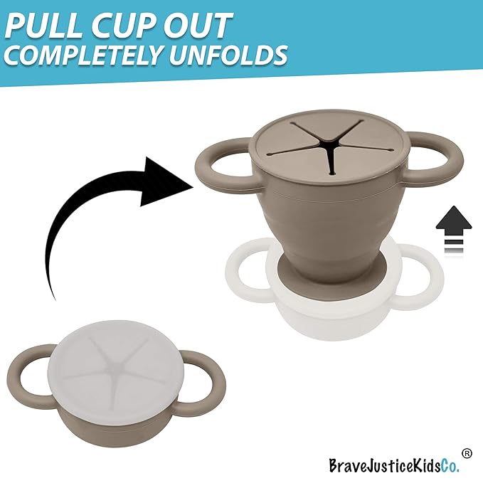 BraveJusticeKidsCo | Snack Attack II Snack Cup | Collapsible Silicone Snack Container | Toddler and Baby Snack Catcher Lid (Fog)