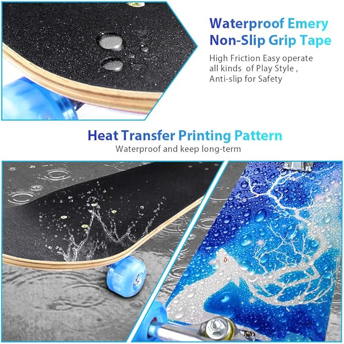 - 【STICK MATERIAL】 7-Ply 31" L x 8" W x 4" H Maple Wood make the wood deck very durable and can bear 220lbs weight , Super soft PU Wheels cut off damping when you riding , Alloy Truck provide more steady structure for skateboard, ABEC-11 Bearings make the wheels turn around more smoothly , Pattern: Heat Transfer(which was printed onto the board,not a sticker.) make the pattern durable a long time.