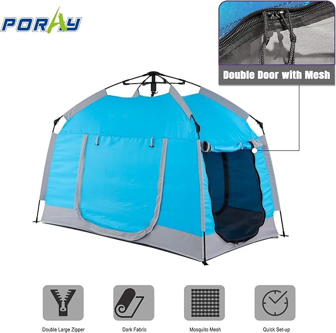- Unique design-The unique wheel hub design makes it only take 3 seconds to open the tent and the setup can be completed with a simple pull. The beautiful three-color LED lighting adds more sensory elements to the tent. This kids tent has 3 zip doors and 2 zip windows. The windows are screened ,and it is very roomy which ensures the ventilation and fun.