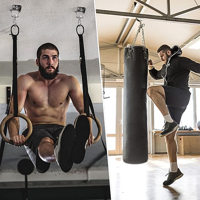 - 360ยฐRotable Ring & Silent Design : Our swing hangers contain Nylon Wear-Resistant Gaskets on both sides to Prevent direct Friction and Noise;360ยฐRotated freely, perfect for Punching Bag and some Yoga Exercise.