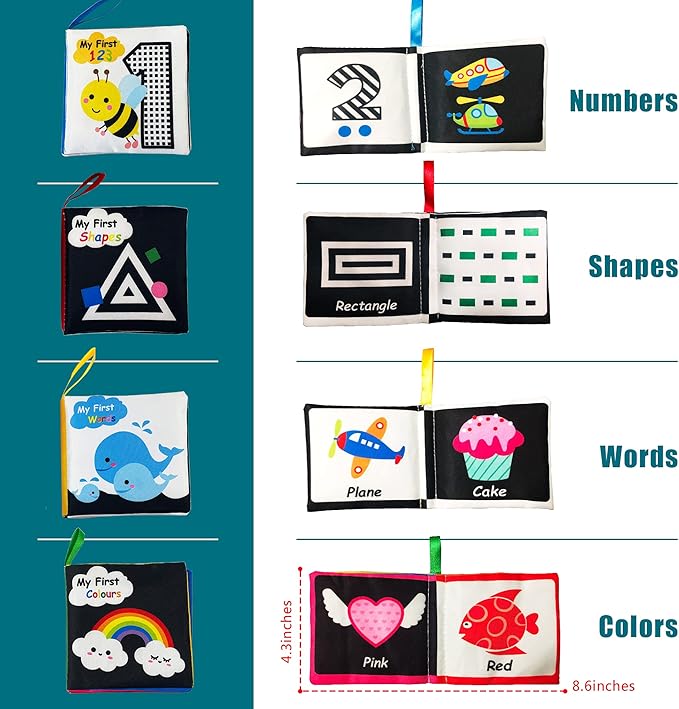 - Pack of 4 themes β numbers, shapes, words, colors, these soft cloth books will help babies to see this word, bring Visual Stimulation, improve memory. It is a great early learning toy.