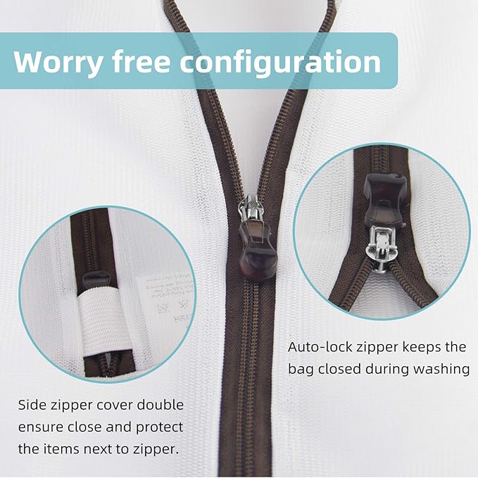 - Upgrade anti-rust zipper with auto lock feature and side small zipper cover will keep the bag closed when washing and drying. Enjoy quiet and a snag-free laundry experience. Don’t forget to tuck the zipper under the cover when doing laundry