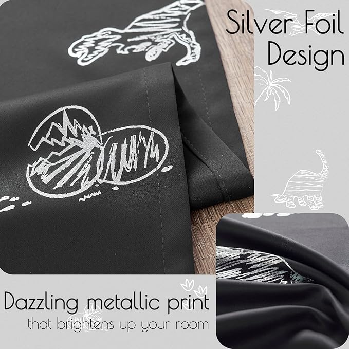 - Dinosaur Foil Printed Curtains: With these two panels 52" wide x 63" long of cute Dino Foil Printed Curtains that will add charm and whimsy to your little ones' room, guest room, or any space that needs a touch of magic