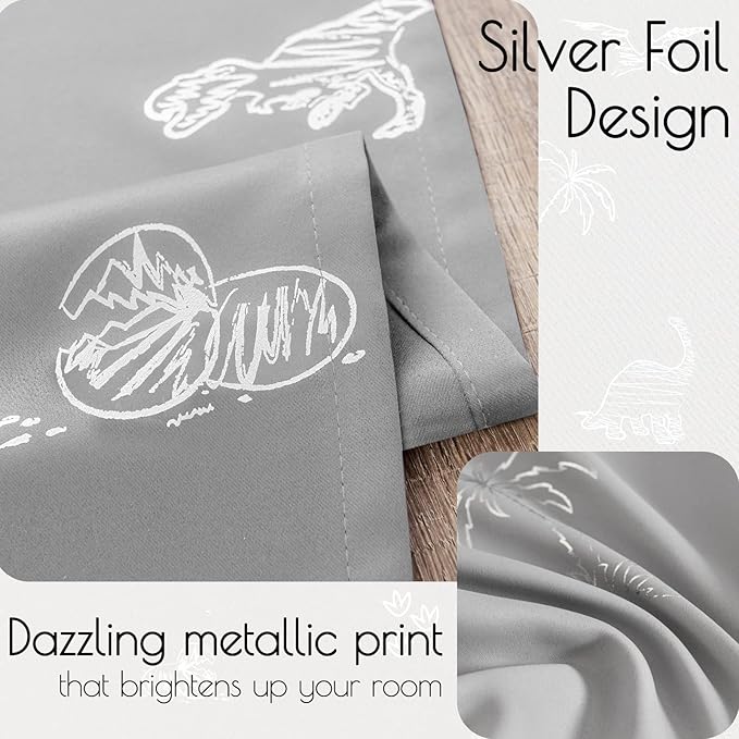 Vangao Grey Blackout Curtains Dinosaur Curtains for Boys Kids Nursery Girls Room Silver Dino Foil Print Thermal Insulated Grommet Top Window Drapes 63 Inches Length 2 Panels