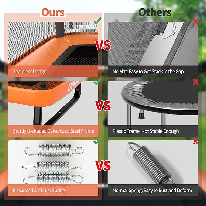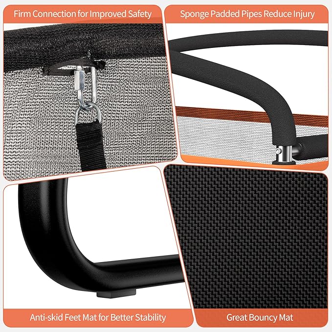 - High Elasticity: Featuring 40 galvanized springs and a high density jumping cloth, this premium trampoline offers an ultimate bouncing experience. Kids will enjoy jumping and release endless energy joyfully. Meanwhile, bouncing helps children bone growth.