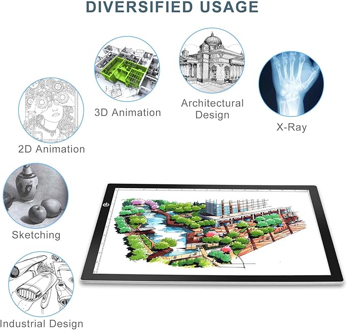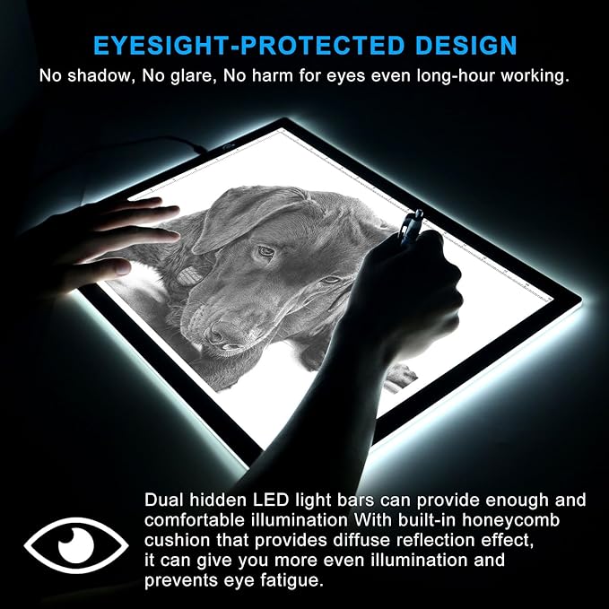 - NO SHADOW, NO GLARE, PROTECT EYES. The light pad providing ideal working lighting environment for penmanship and design. Providing the most comfortable lighting environment for animators, designers, art enthusiasts. children and reader.