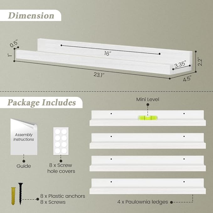 - 【Perfect solution for your walls】The floating shelves for wall & picture ledge shelf is SAME SIZE as each other (L 23.1" x D 4.5" x H 2.2") and is such an easy way to display photos without making lots of holes in your walls. The nursery book shelves are crafted from Paulownia wood which are lightweight yet proportionately strong, sustainable real wood. They come fully assembled and all mounting hardware is included in the package. Sturdy enough to hold up to 20 lbs with proper installation.