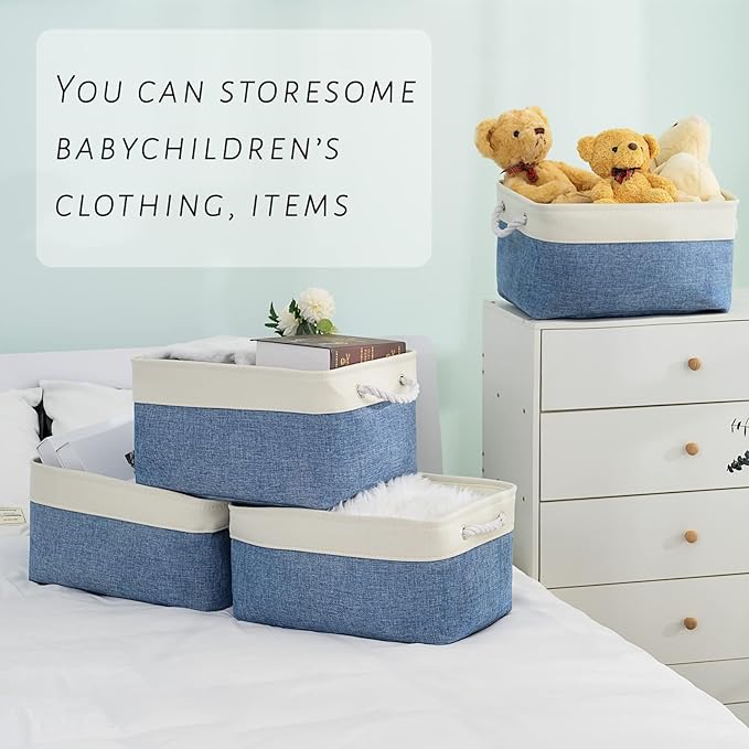 TcaFmac Storage Basket for Organizing - Large 4 Pack Fabric Storage Bins Baskets for Shelves with Ropes, Foldable Storage Cubes for Closet Cloth Toy (White & Blue16x12x8 inch)