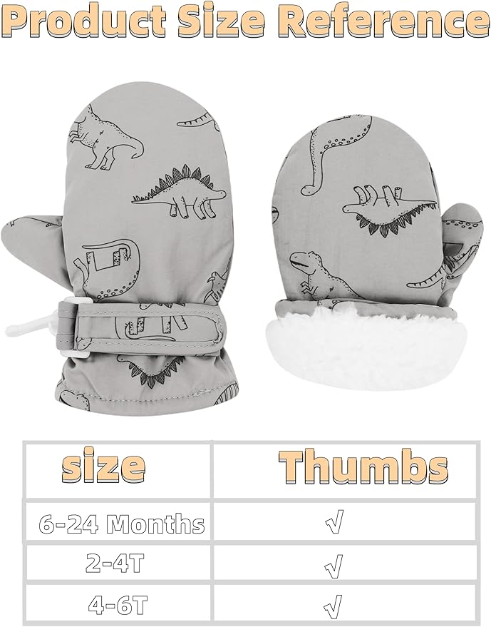 - This toddler fleece mittens have 3 sizes for your reference: Small size fit 6-24 month baby w/O thumbs, Middle size fits 2-4T toddler and Large size fit 4-6T Kids.