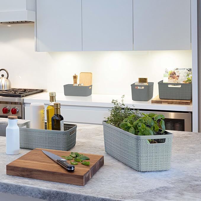 Curver Jute Decorative Plastic Organization and Storage Basket Perfect Bins for Home Office, Closet Shelves, Kitchen Pantry and All Bedroom Essentials, Set of 8 Grey