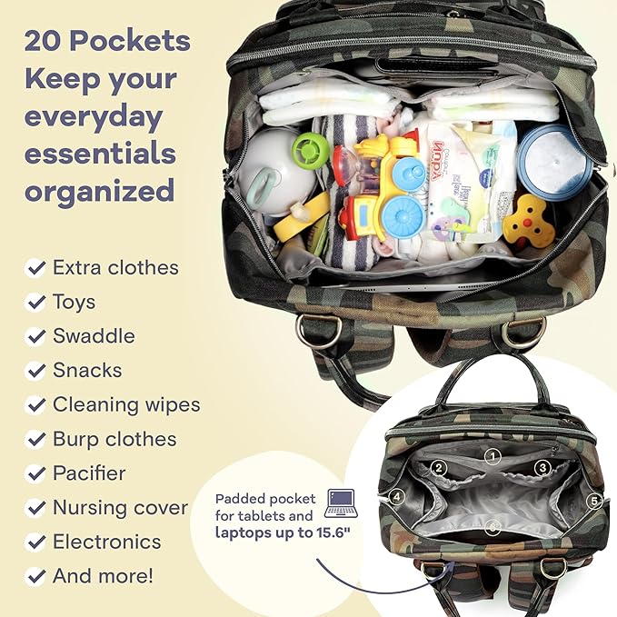 RUVALINO Diaper Bag Backpack, Multifunction Travel Pack Maternity Baby Changing Bags, Large Capacity, Waterproof, Green Camo