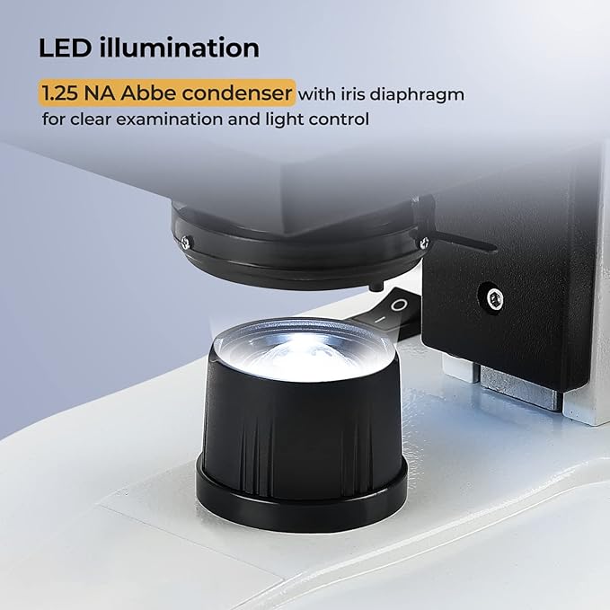 - [Mechanical Stage]: With 1.0mm stage divisions, locks slide into place and provides precise slide manipulation along the X- and Y-axis to allow coordinates to be recorded, enabling the viewer to return to a specific location on the slide.