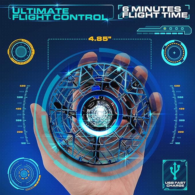 - 360ยฐ Rotating Flight Design: Fly this mini UFO drone toy with your hands! Place both hands on both sides of the drone, swipe a hand under when the lights start to blink rapidly, and watch this LED drone perform a 360ยฐ flip!