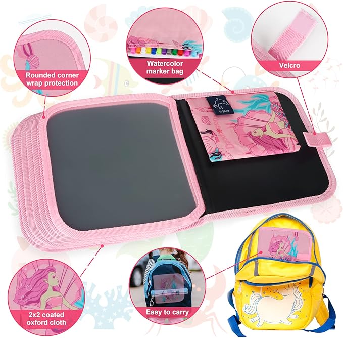 Erasable Doodle Set for Kids - Reusable Magic Drawing Book with 12 Watercolor Pens 14 Page Drawing, Road Trip Car Game Writing Painting Set for Boys and Girls (Mermaid)