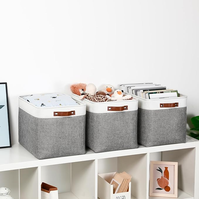 DULLEMELO Large Storage Baskets, Fabric Storage Basket with Leather Handles for Shelves Closet Nursery Toy Storage, Collapsible Fabric Baskets for Toy Book Magazine Towel Organizers(White&Gray)