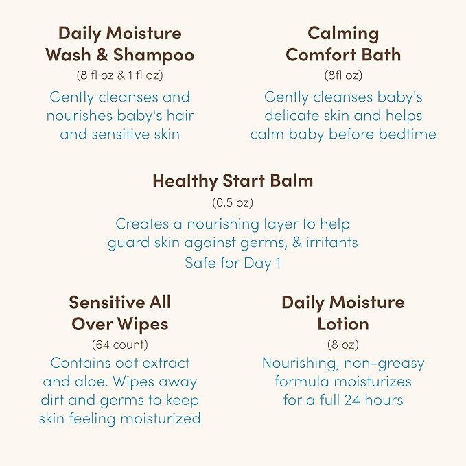 - .5-ounce tube of Aveeno Baby Daily Moisture Healthy Start Balm. Made with prebiotic oat, balm leaves a nourishing layer to help moisturize baby's developing skin. Gentle enough to start using at day 1 of life for proactive skincare