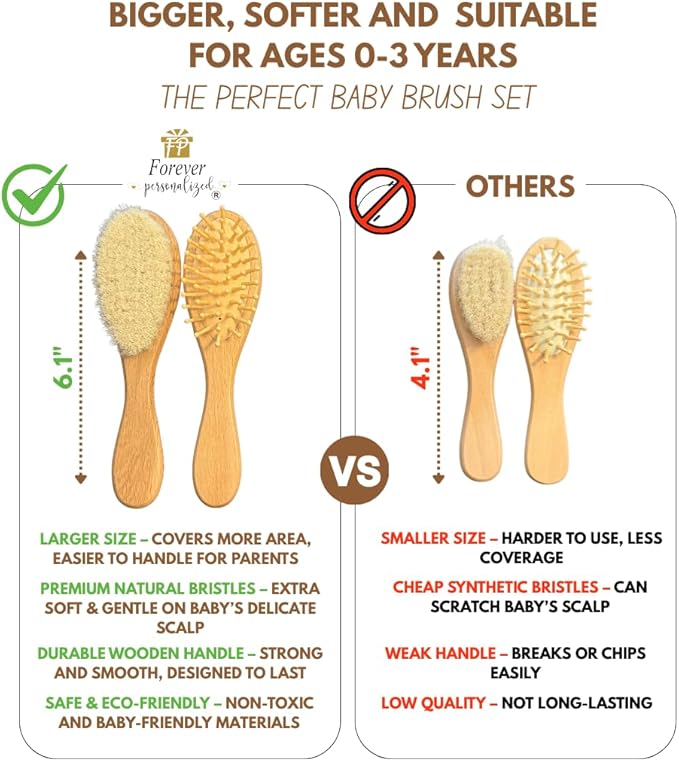 - The natural wooden comb is gentle on tangles and tiny knots. The soft natural bristle brush is gentle on baby's head, helping to remove cradle cap, evenly distribute the hairs natural oils and while being gentle enough to protect baby's soft spot.