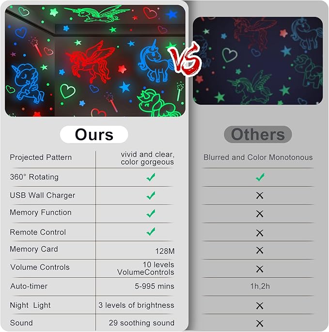 - 【ADDS A VARIETY OF FUN TO YOUR LIVING SPACE】The high-power LED lamp bead projected pattern is more vivid and clear, making the color far more gorgeous.Silent 360-degree rotating design and 8 different color lighting effects. Projects soothing images of dreamy unicorn on the ceiling and walls. Let your baby focus on following the spinning unicorn pattern to attract your baby's attention, thus calming emotions and relaxation for a quick sleep. No more struggling with bedtime!