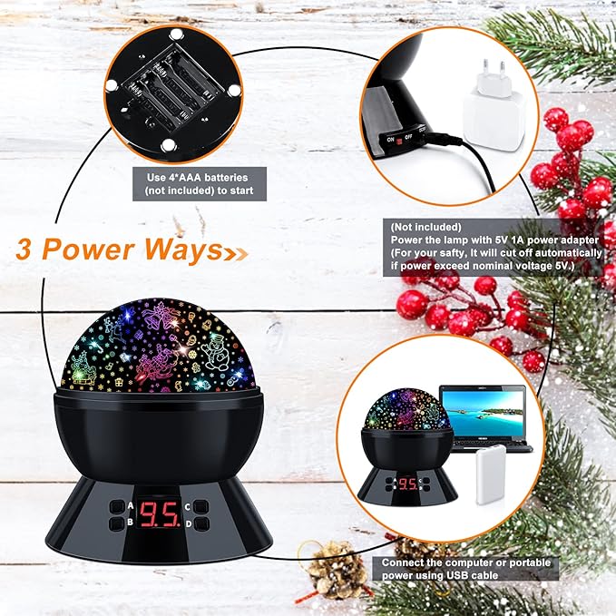 - 2 Projector Film Design: I comes with 2 film options: Dinosaur patterns and Christmas element , easy to change the patterns films lenses which is equivalent to buying two lamps with different projections for the price of one lamp. 360° rotation LED light projector delivers 17 lighting effects, getting you to immerse in the scene! Please take off Christmas element film cover when you use the Dinosaur film.