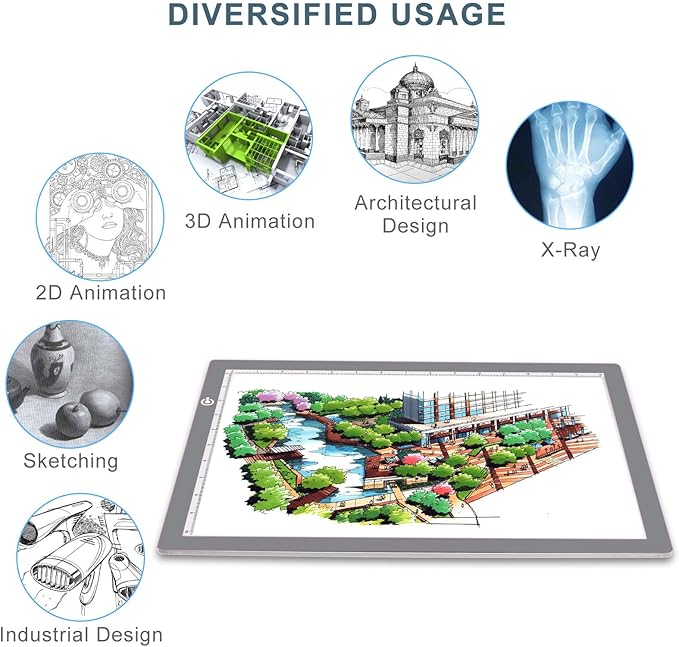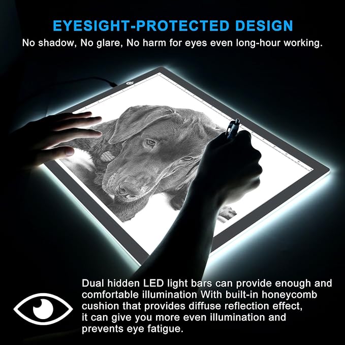 - NO SHADOW, NO GLARE, PROTECT EYES. The light pad provids ideal working lighting environment for penmanship and design. Providing the most comfortable lighting environment for animators, designers, art enthusiasts. children and reader.
