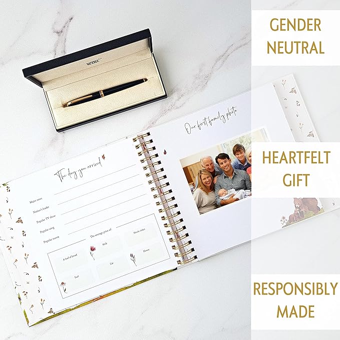 - EXQUISITE HEIRLOOM, made with the FINEST materials: Kids N' All memory books are made from ARCHIVAL GRADE, RESPONSIBLY SOURCED FSC (Forest Stewardship Council) PAPER, a Sustainable Forest Management Solution. The THICK 200GSM WOOD-FREE PAGES mean you can confidently use an ultra fine-tip sharpie with NO BLEEDS. Our woodland baby book features a STURDY PROTECTIVE BOX and a GOLD-TINTED metal double SPIRAL BINDING with SPOT UV VARNISH imprinted on a MATTE LAMINATED COVER for a LUXURIOUS FINISH.