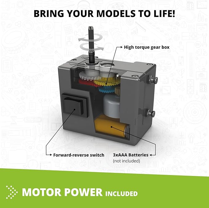 - EXPLORE STEM CONCEPTS: Build 5 motorized working models, such as a brontosaurus, a stegosaurus, a triceratops and more. Thanks to the kit's motorized components, your child can bring each model to life and watch as it moves and interacts with its surroundings.