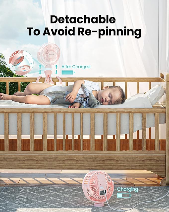 - Upgraded Flexible Durable Tripod: Shell made of food-grade silicone, safe for the baby; Optimized the tripod fixing method, which is more durable and not easy to fall off; You can remove the fan head to charge at will, no need to repeated fixation