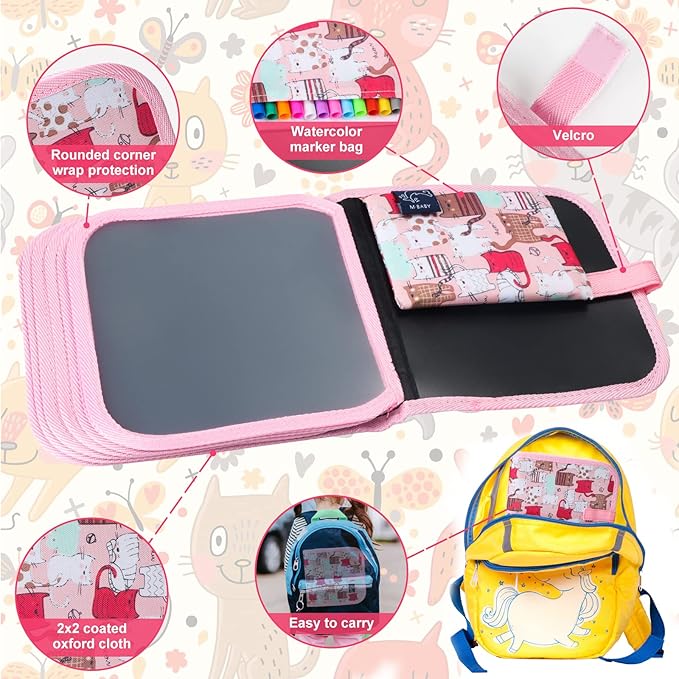 - ๐จKid's Road Trip Essentials--Kids Erasable Graffiti Book has sticky buttons on the outside to keep it in place and a pens pocket on the inside for 12 watercolor pens. Even in cars, planes and other means of transportation, kids can draw as much as they want.
