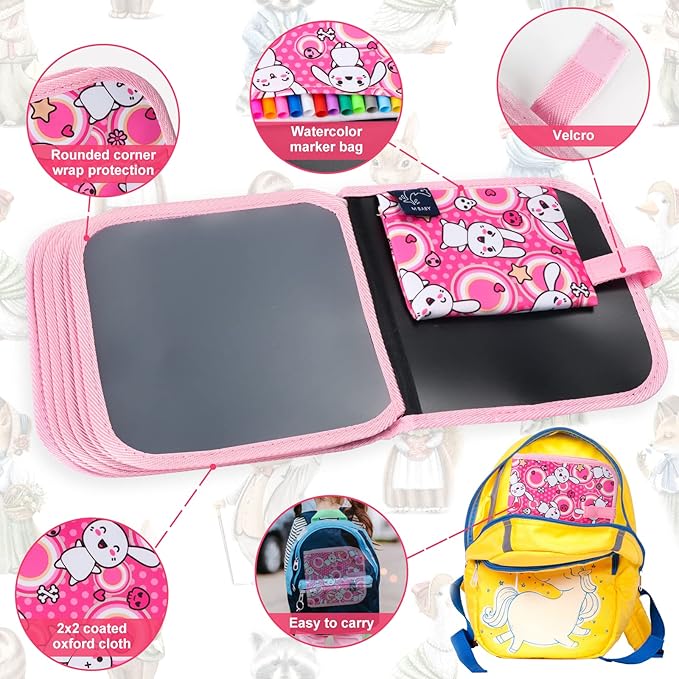 Erasable Doodle Set for Kids - Magic Drawing Book with 12 Watercolor Pens, 14 Pages - Road Trip Car Game Writing Painting Set for Boys and Girls (Rabbit)