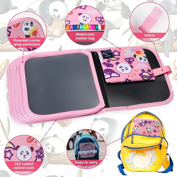 Erasable Book Doodle Set for Kids,Reusable Magic Drawing Book for Kids with 12 Watercolor Pens 14 Page Drawing,Road Trip Car Game Writing Painting Set for Boys and Girls (Panda)