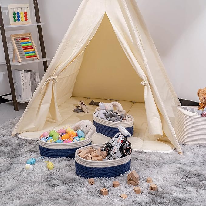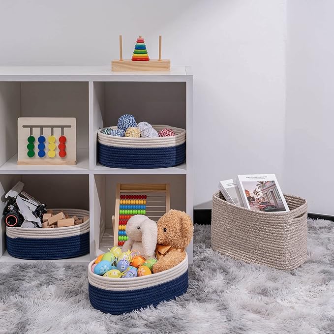 Off White&Navy Shelf Basket to Store and Organize Household Items/Baskets&Bins for Daily Storage &Organizing/Woven Rope Basket for Living Room, Bedroom,Small Oval-13x8.66x5.11’’,3 Packs