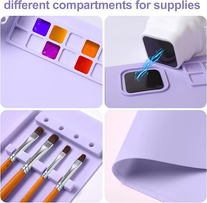 - [UNIQUE DESIGN] - Silicone painting mat has a collapsible attached cup with brush holders on the side and top, built-in paint wells, and brush rests. Keep clean while creating efficiently.