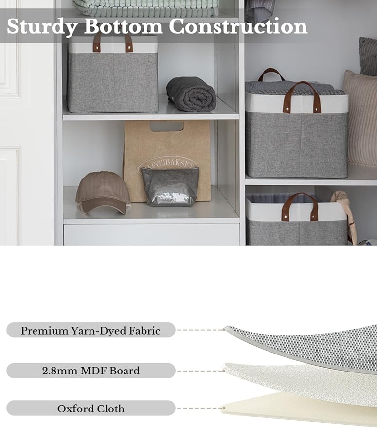 - Premium Quality: Made from high-quality fabric and reinforced with a heavy-duty MDF bottom board and a sturdy metal frame. The solid construction enables the storage bins to stand upright without support, even when empty.