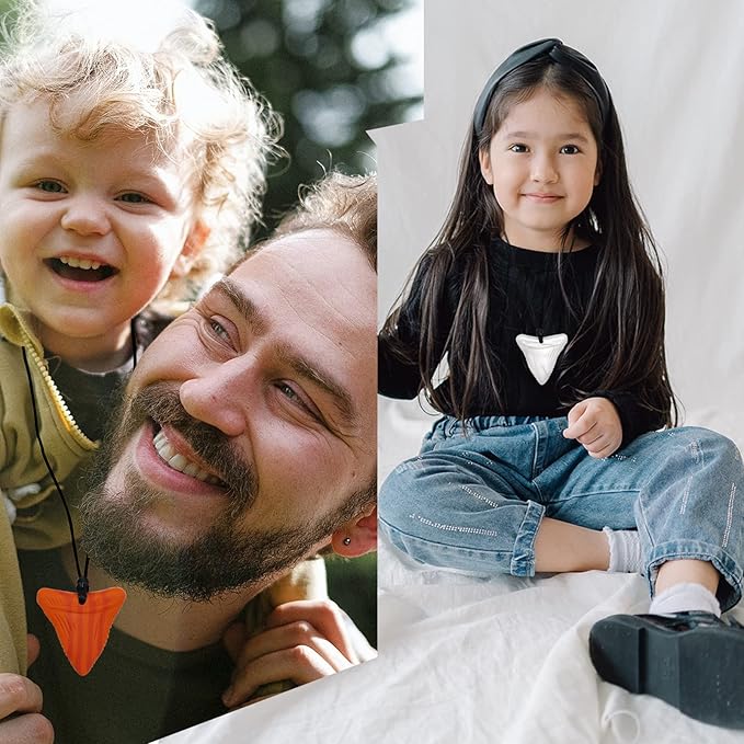 - ★ PATENTED AND STYLISH DESIGN - Adjustable string & breakaway clasps make the autism chew toys sensory safe to use for most children. Shark tooth patented design chewing necklace sensory chew toys easy to grab, not stuck in throat.