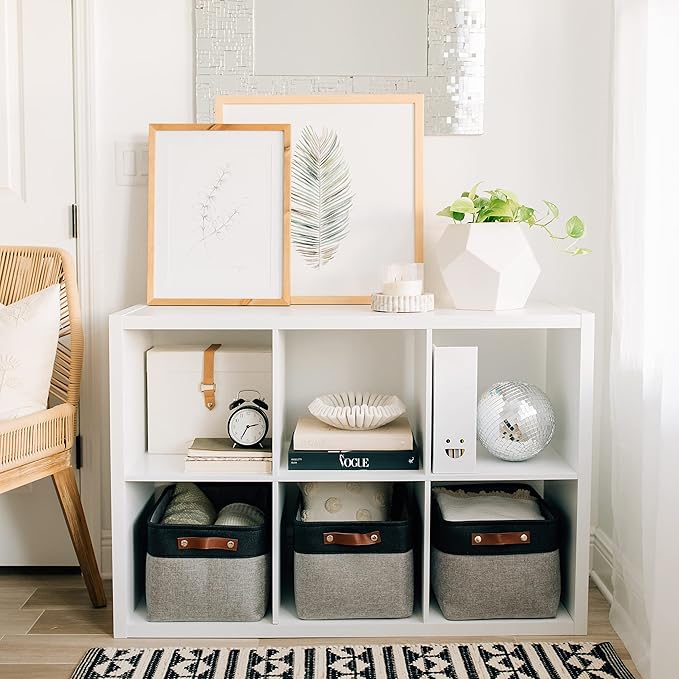 - Decorative Fabric and Vegan Leather – These versatile storage baskets for organizing your everyday life are made with a thick, high-quality fabric and fitted with leather handles to add a stylish touch to a living room, bedroom, office, or personal space.
