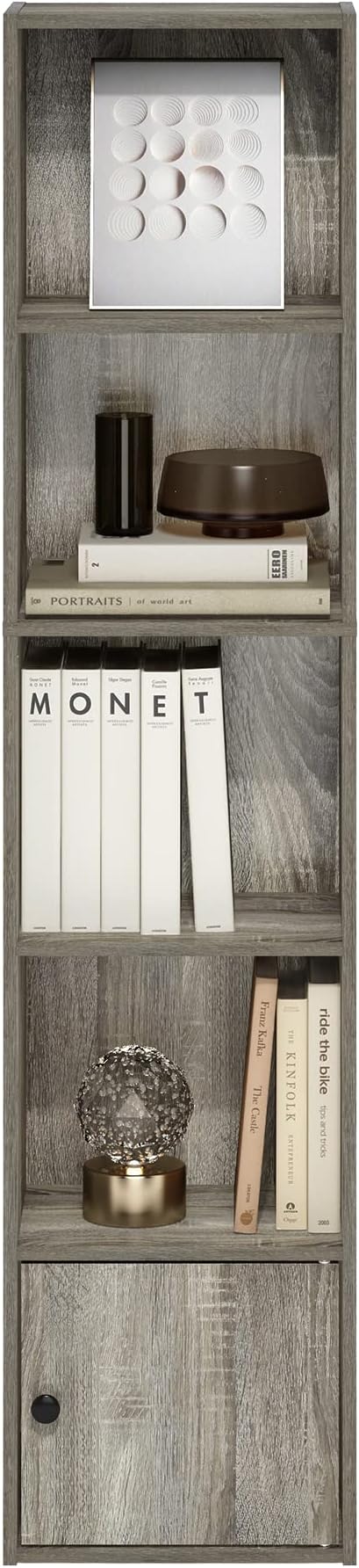 - Features 4 open shelves for display and storage. Closed cabinet at the bottom to keep your room away from clutter. Each shelf holds up to 15lbs.