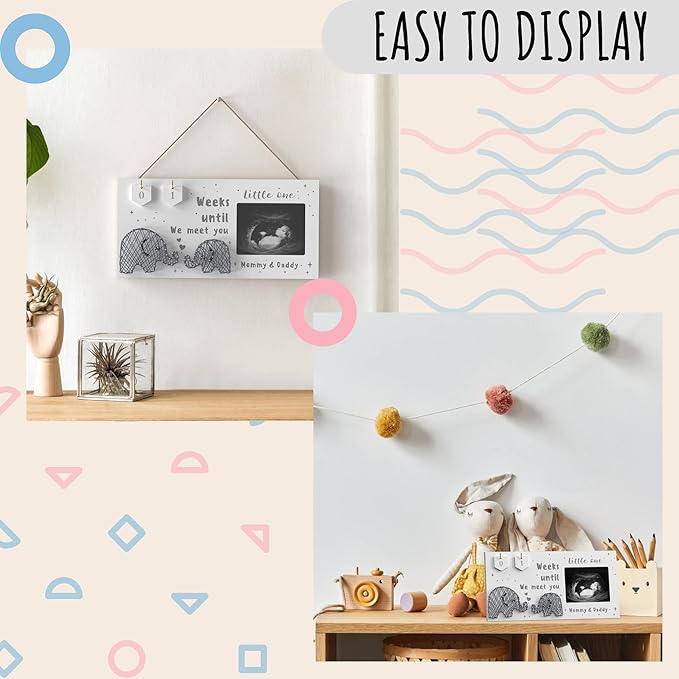 - Baby Countdown Frame - Celebrate the joy of expecting a new arrival with our ultrasound picture frame. Featuring a charming countdown display made up of two wooden number plaques, the frame allows you to track the weeks until your little one's arrival. Whether it's displayed on a mantle, bookshelf, or bedside table, our Baby Countdown Frame is sure to bring warmth and excitement to any room.