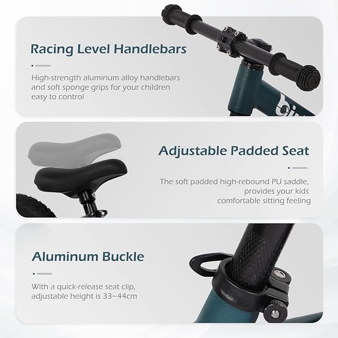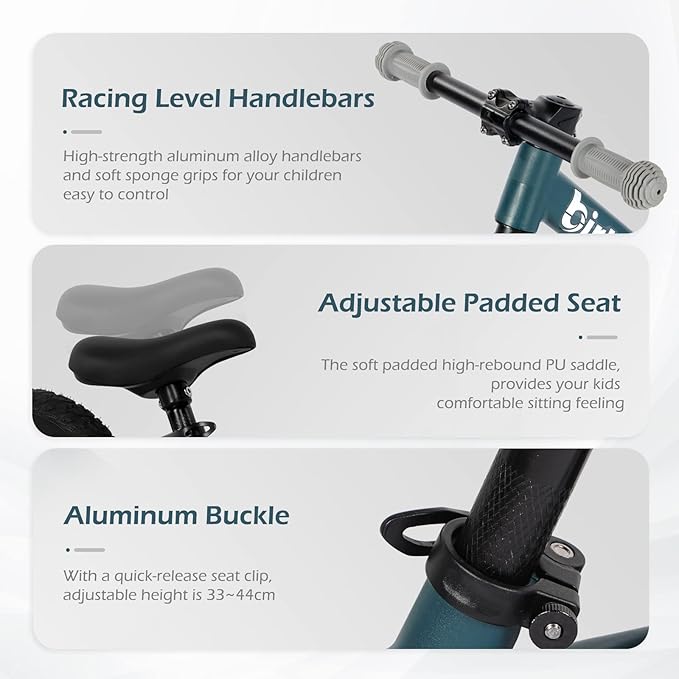 - HANLERBAR AND SEAT - Racing level non-slip handlebars for safe and comfortable ride. Adjustable seat with a height from 13 inches to 17.3 inches, can be set for kids according to their height. The aluminum quick release seat clamps allows for No Tool saddle height adjustments. A U-shaped footrest wrapped on both sides, allowing kids to relax their foot while on a bike ride.