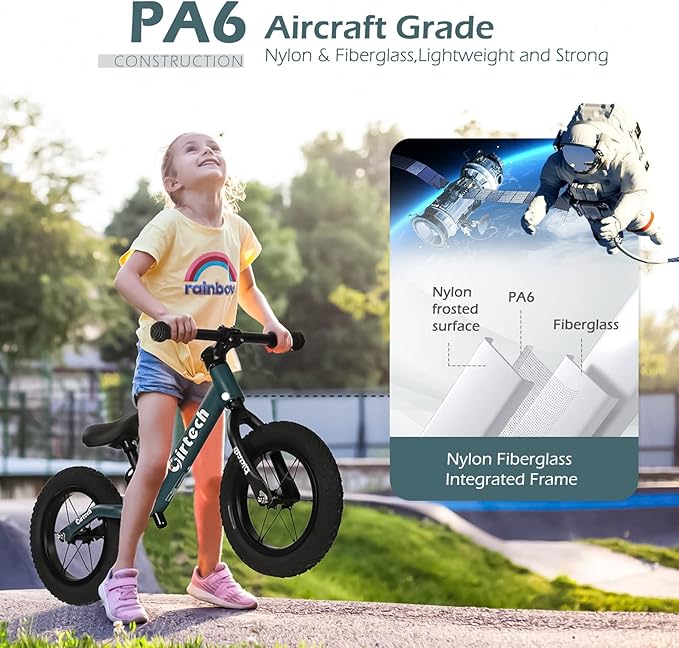- INTEGRATED NYLON FRAME - Constructed of Aircraft Grade PA6 and fiberglass integrated molding, Frame constructed in one piece without any welding brings a smooth and beautiful appearance. The nylon frame is sturdy and lightweight., weights 6.4 lbs, the lightweight balance bike frame design makes the bike easier to control for kids.