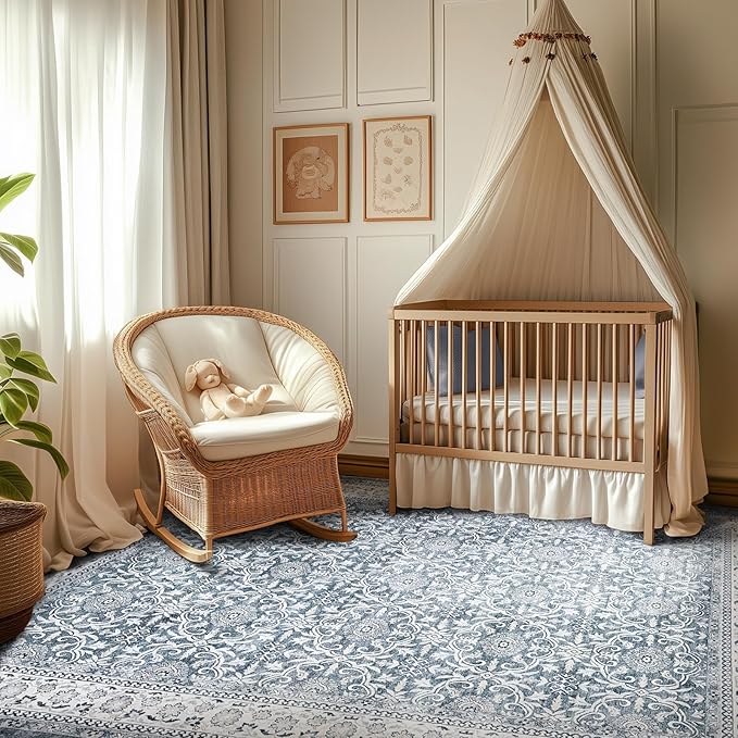 jinchan Floral 5x7 Area Rugs for Bedroom - Machine Washable Vintage Distressed Boho Design Throw Rug Stain Resistant Carpet Low-Pile Thin Non-Slip for Nursery Living Room Dining Room (5‘x7',Grey)