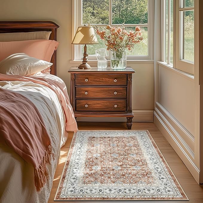 jinchan Washable Area Rug 3x5 Entryway Low Pile Boho Floral Print Rug Faux Wool Soft Indoor Doormat Stain Resistant Non-Slip Ultra-Thin Rug Kitchen Living Room Bedroom Dining Room Office Orange