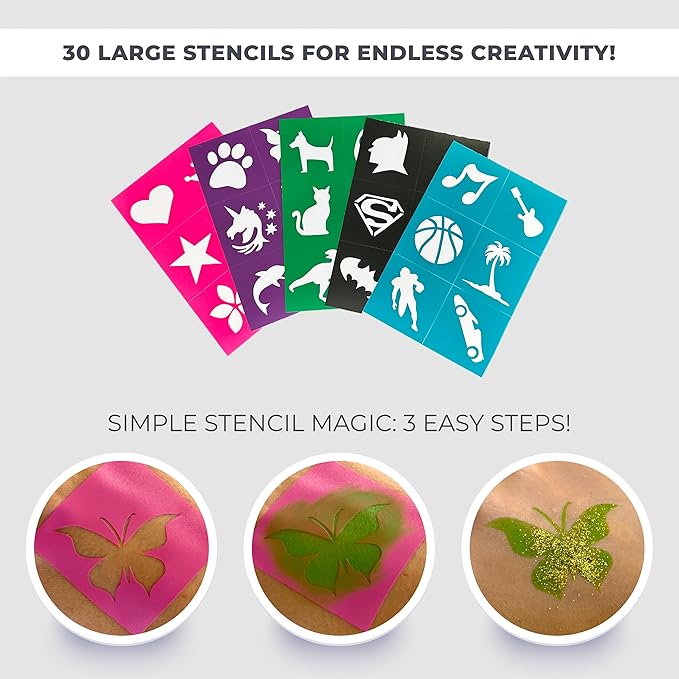 - Discover Ultimate Fun: Dive into the world of creativity with Zenovika's face painting kit, boasting 26 vivid colors, 2 metallic shades, 4 neon glow in the black light, 30 reusable stencils, 3 brushes, 2 glitter powders, 2 sponges and an instructional face paint book with 39 designs